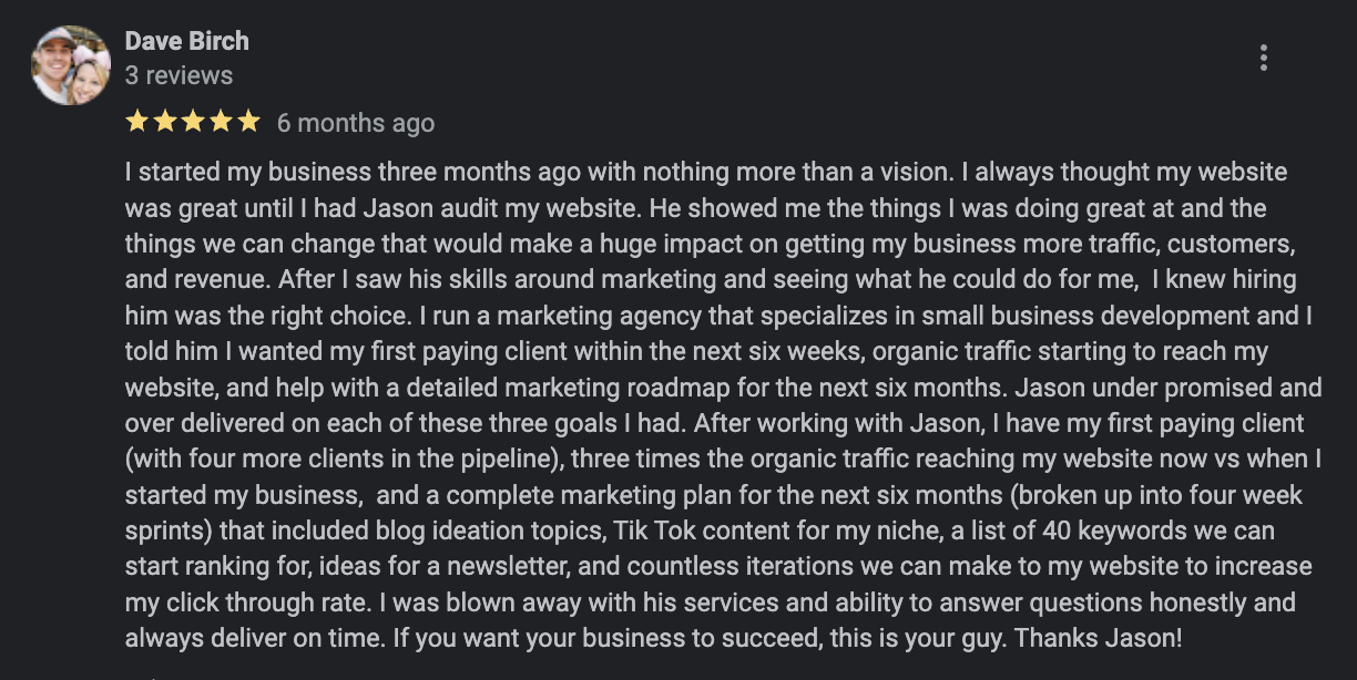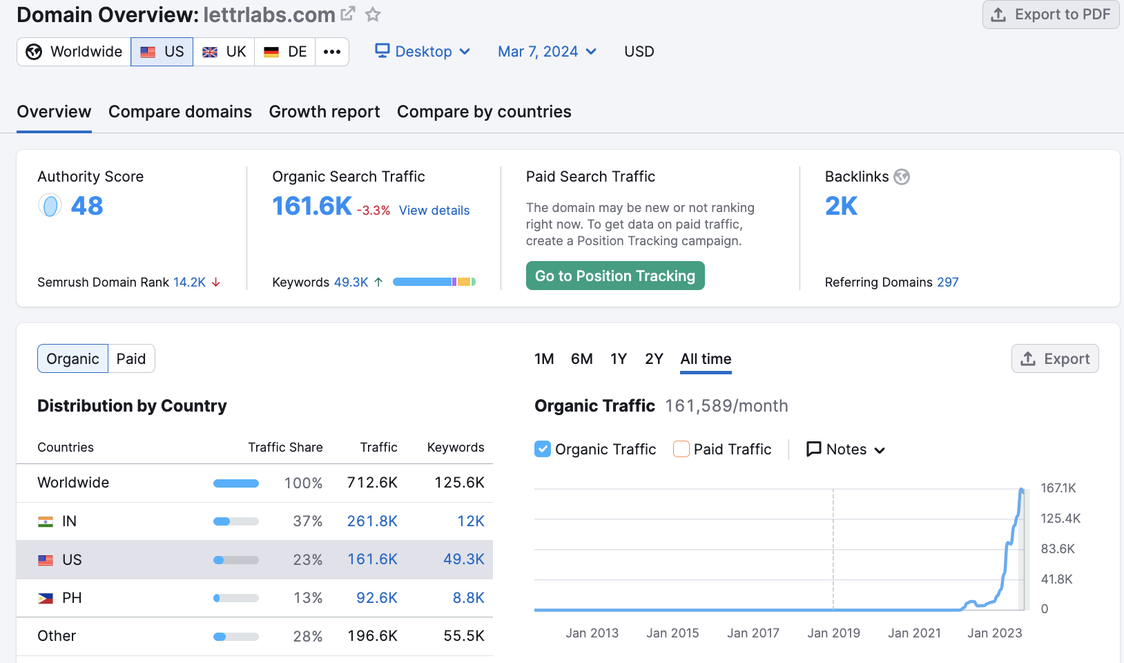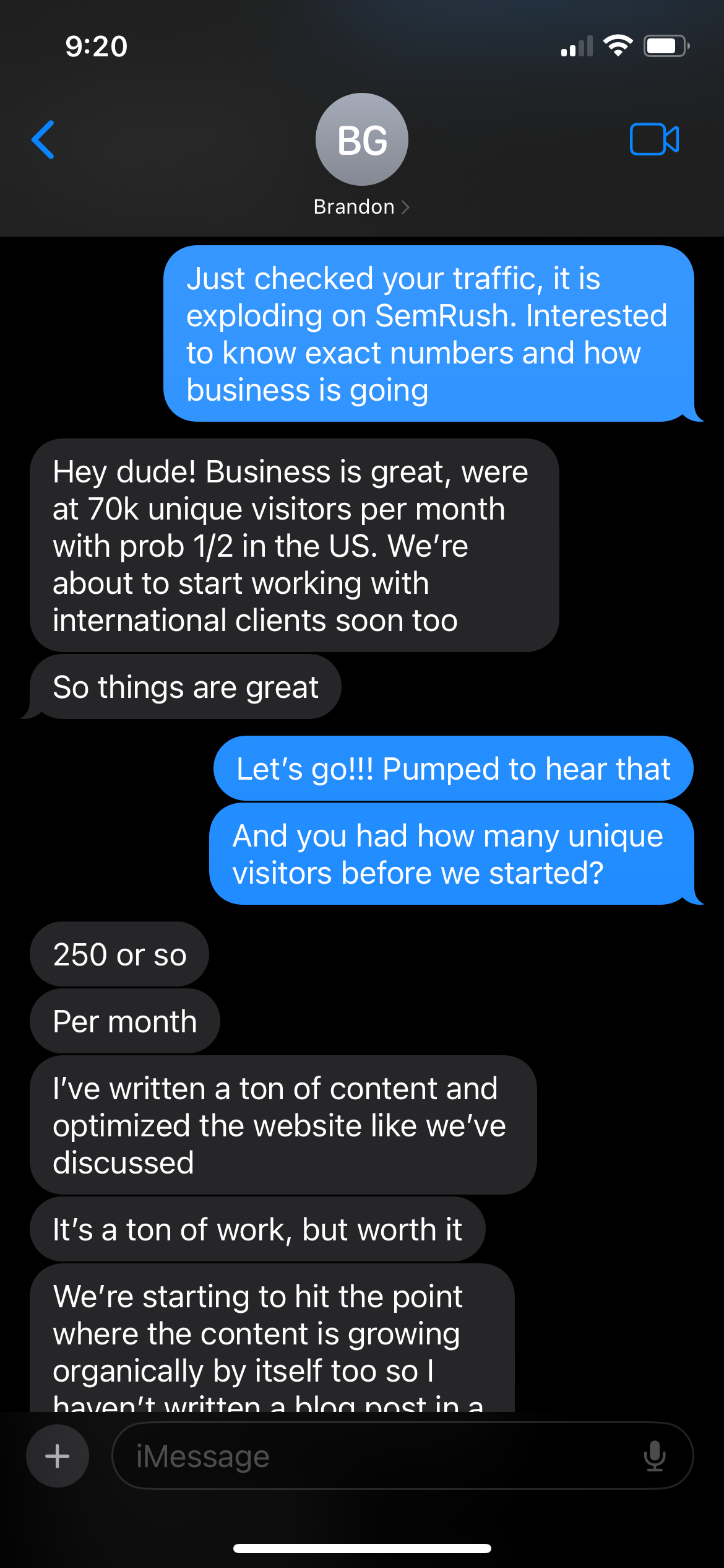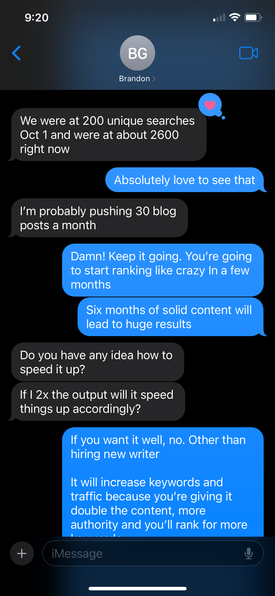 LettrLabs, a digital marketing company reached out to bolster their website traffic in July 2022. They had NONE. After a few weeks of working with their team, we saw progress. A month later we were seeing 5,000 visits a month. Worked them up to consistently over 150,000 organic visitors a month….and they closed an $80,000 DEAL BECAUSE OF SEO!! (Don't believe me, just ask their co-owner Brandon)